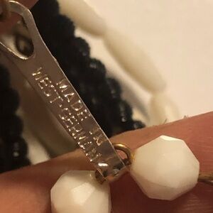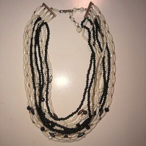 Vintage West Germany lucite beaded multi strand necklace - black and white beads - some beads are black with and iridescent shine.