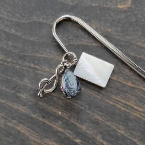 • Abalone, mother of pearl, and silver tone (likely silver plated) treble clef dangling charms