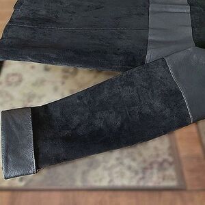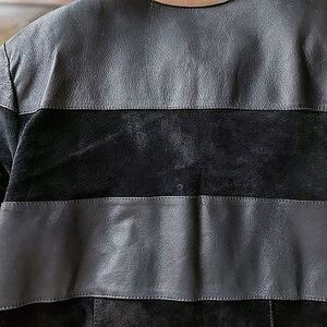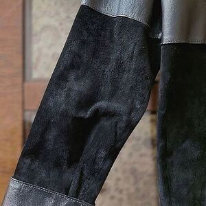 Gorgeous collarless black on black suede jacket with leather panel detail