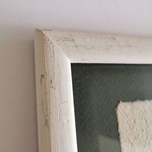 White frame has scuffs/bumps as shown, and cardboard backing is simply taped to the frame so the glass is not kept flush to the frame, it does move when the piece is moved.