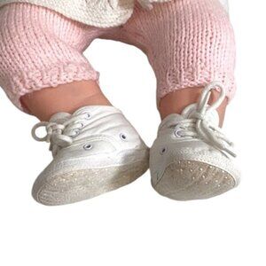 Change 1: Hand-knitted pink capris, white sweater, white booties