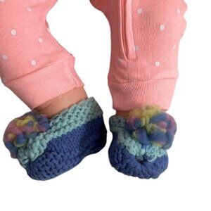 Change 3: One piece pink knitted sleeper with blue knitted slippers
