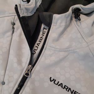Vuarnet of France, spring/fall hooded coat in silver grey. In excellent used condition. Coat has a bit of a reflective quality with the pattern. Fuzzy interior to keep you warm and comfortable. Double zipper so you can open the coat from the bottom or top.