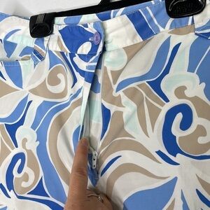 In great condition. 53% nylon 44% cotton 3% spandex. Front and back pockets. Fold manufactured hem. Beautiful abstract print. Belt loop. Measure lay flat: waist 15,5'' hips 19,5'' rise 10,5'' inseam 19'' bottom wide 8,5''.