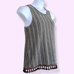 This sleeveless contemporary piece by W5 (Anthropologie) is incredibly soft and may never have been worn. The top is black and white plaid/stripes with a round neckline and a decorative line of orange and black going all the way around the flared bottom, from which black thread tassels hang. The top has a casual, relaxed fit and is great for everyday wear.