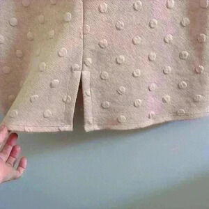 • Style: Pullover, thicker like sweater material, polka dot pattern, 3/4 zipper on back, short sleeves, small split hem on back, oversized, very stretchy