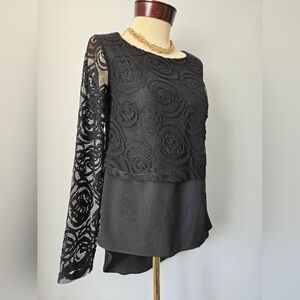 Incredibly lightweight and delicate blouse. Lace overlay with pinwheels. Sheer long sleeves.