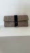 Women's grey felt wallet clutch has a foldover top with black leather closure strap that has two positions to close the wallet. Zipper compartment on front. Black leather accordion sides and card holder. Two compartments with room for 3 cards inside and three other slots. My iPhone 13 fits inside. There is a stamp on the front of the leather strap, unclear if this is the brand mark.