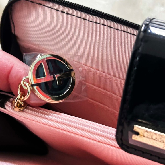 WALLET, GIORGIO ARMANI, BLACK SATIN & PATENT, ZIP CLOSURE AND DOME FLAP, INSIDE POCKETS, GA PURSE CHARM, TAGS ON NEW NEVER USED, NO DAMAGE