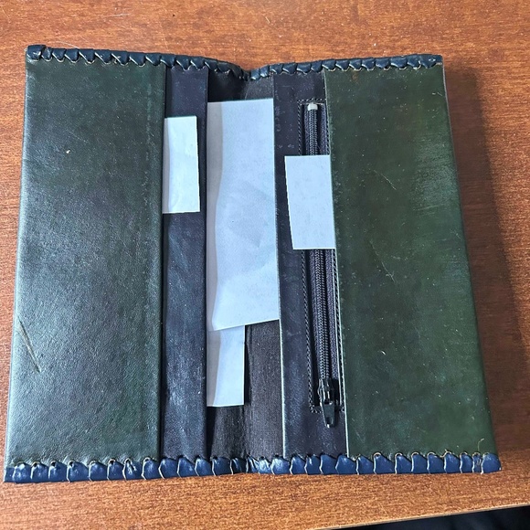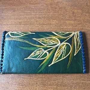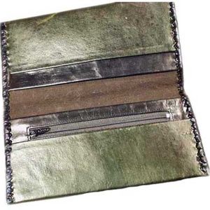 WALLET, LEATHER, ARTIST-MADE, ONE-OF-A-KIND LOST WAX METHOD, MADE IN BRAZIL, 8 x 5 inches, GREEN-GOLD-CREAM, ZIPPED INNER POCKET, MONEY AND CREDIT CARD POCKETS, LEATHER LACE, HANDMADE IN RIO DE JANEIRO