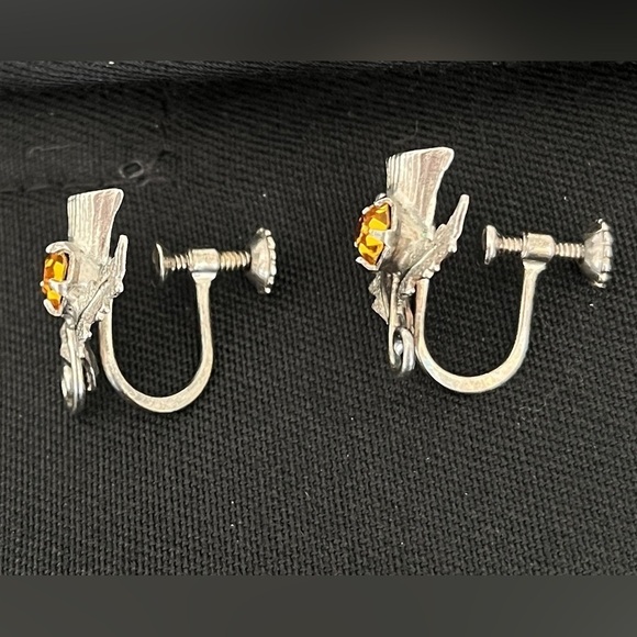 This vintage sterling silver Scottish thistle flower brooch and earrings are a matching set. The brooch has a lucky wishbone design with a thistle flower in the centre of the brooch pin. The matching screw back earrings feature a Scottish thistle. The brooch and earrings are sterling silver, marked on the back of the brooch and earring backs as shown in photos. Each piece has a citrine coloured paste flower in the thistle. The maker of the earrings (and I believe the brooch as it matches although it is unmarked) is 'WBs' (Ward Brothers) marked on the back of the earrings.