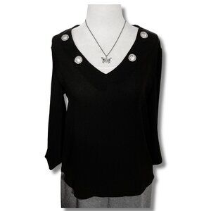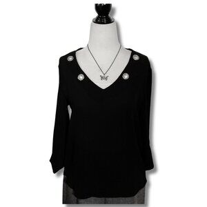 Elegant, breezy, and fabulously versatile, this lovely women's semi-sheer black v-neck roll-tab sleeve shi is made all the more special by the inclusion of oversized silver tone metal grommets along the neckline.