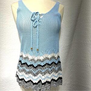 Beautiful Crochet Boho Tank Top with cross cross tie up front in blue with blue, white, grey and black zigzag pattern along bottom portion. Throw over tank or bralette with your favourite jeans. Great cover up for the beach.