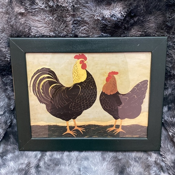 Charming art print featuring a rooster and hen. Set in a black frame. Perfect for rustic decor.