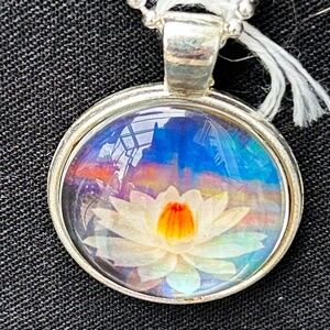 WATER LILY PENDANT NECKLACE, HANDMADE, GLASS DOME ON METAL, 23 INCH SILVER-TONE