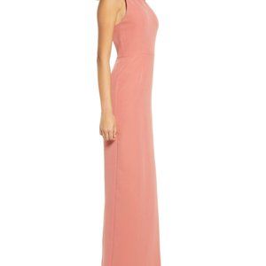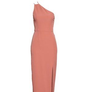 one shoulder mirrors the flash of leg at the skirt of this asymmetrical column dress cut from soft, matte fabric and suspended by dainty straps.