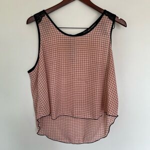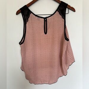 Stylish pink sleeveless top with a grid pattern. Features black trim and lace details on the shoulders. Size large like new