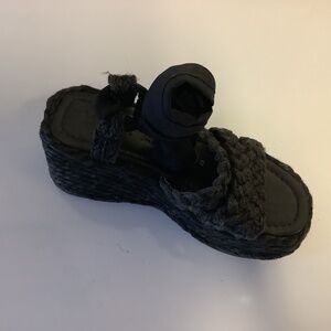 New black charcoal wedge espadrilles with lace-up ankle ties. They feature: