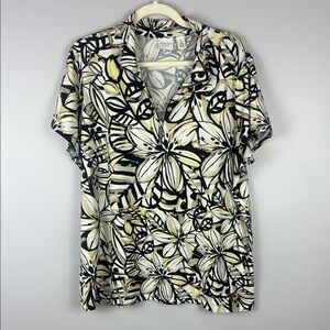 WEEKENDS BY CHICO'S 1/4 Zip White Black Gold Floral Stretch Athletic Top Size 3