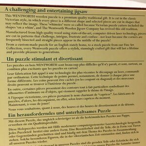 A Wentworth wooden jigsaw puzzle featuring Mozart. It is approx. 250 pieces. It comes in a dark green cloth pouch and when complete measures 10 x 14 inches. It is complete and all the pieces are in excellent condition. The pieces are different shapes and whimsical.