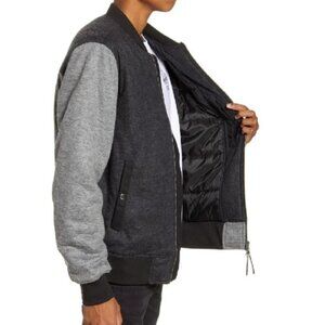 A contemporary take on the classic bomber jacket, this one is cleanly styled with neutral color blocking and soft woolen fabric.