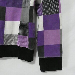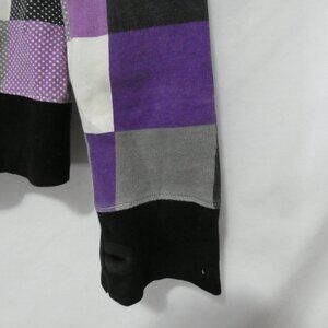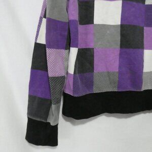 Featuring a bold pattern of purple, black, grey, and white squares, this hoodie stands out with its eye-catching design