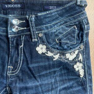 Adorable Western Jeans with Floral details and lots of Rhinestones. From the brand Vigoss. Very comfortable denim with some stretch so you can do anything in them!