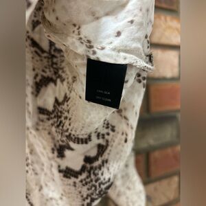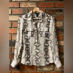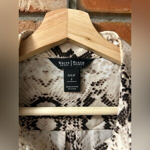 Elevate your wardrobe with this stunning White House Black Market Silk Snake Print Blouse. Crafted from luxurious 100% silk, this blouse features a chic snake print pattern that adds a touch of sophistication to any outfit. The blouse includes optional roll tab sleeves with button closures, allowing you to customize your look for any occasion.
