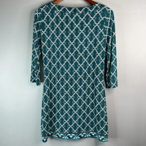 Ladies jade teal green black and white White House Black Market retro print round neck 3/4 sleeve mini dress.