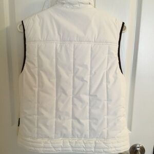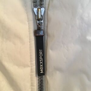 White MEXX puffer vest with black trim, front zipper closure and two zip side pockets.