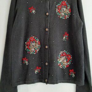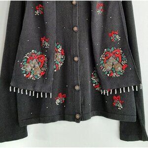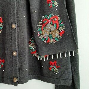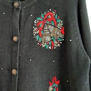 WHITE STAG Vintage Embroidery & Bead Work Christmas Bells Cardigan Sweater Sz XL