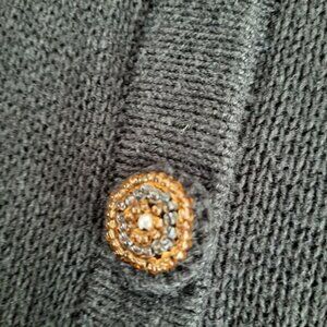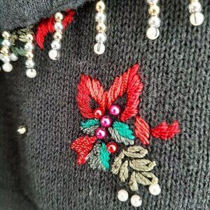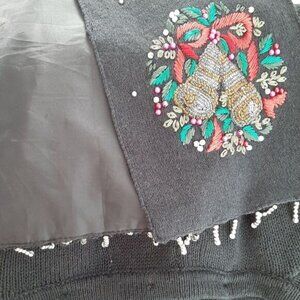 • Long sleeve knit cardigan jacket with hand embroidered and beaded wreaths, bells and flowers. Removable satin backed scarf (attaches with three buttons at the neck). Hand beaded buttons.