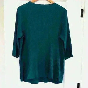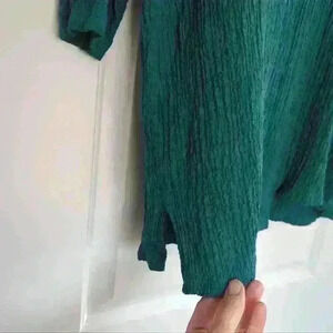 • Style: Pullover, slight v-neck, 3/4 length sleeves, white sewn on pattern around neck, crinkled material, very stretchy, side split hems, relaxed fit