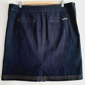 • Mini skirt in dark blue denim with decorative contrasting stitching at hem, side zip closure and back slit.