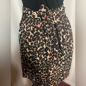 Leopard Print Skirt in Black/Brown/Coral is fun and flirty. Lightweight, designed for above-knee length, extra-wide gathered waist with built in sash to tie at the back. Lined and has pockets!