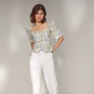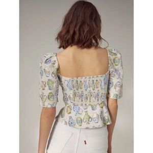 WILFRED Aritzia Linen Smocked Puff Sleeve FATALE Vase Print Blouse XS