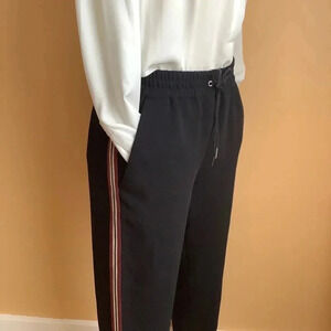 The Wilfred Buffon Pant is a dressy jogger pant with side stripe. These joggers have a soft, elastic waist with a drawcord and ribbed cuffs at the ankles. They're made with smooth Japanese crepe that has a matte finish and drapes beautifully. Black with side stripes in hues of red, brown and white.