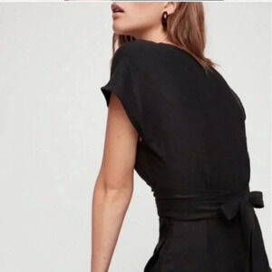 WILFRED Brax Linen Wrap Jumpsuit Wide Leg V Neck Cap Sleeve Black Aritzia 0