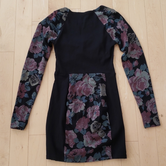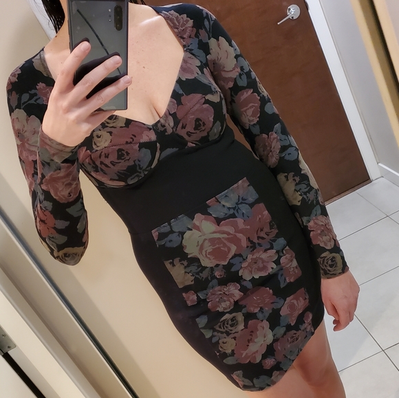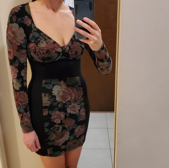 Fitted black and vintage floral print long sleeve mini dress from Aritzia. Low cut. Lots of stretch throughout for the perfect tight fit.