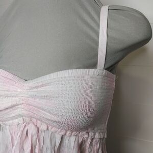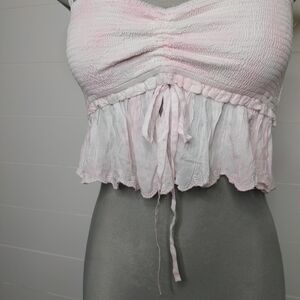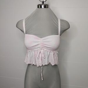 This is a cropped tank with a smocked bodice, adjustable straps and a self-tie at the front. It's made with a lightweight modal. This version of the Dareau comes in a custom tie dye. In excellent condition.