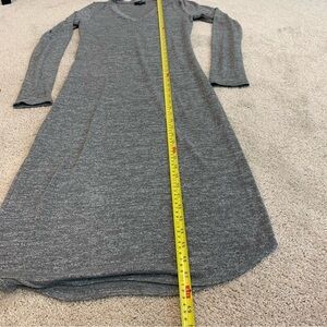 Aritzia brand Wilfred dress. Lightweight knit fabric. Sweater dress style. Long sleeves. V neckline. Midi length. Marled light grey colour. Made with Aritzia's soft jersey knit Reposa fabric. Body hugging fit with added stretch. Rounded hemline.