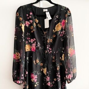 This is a fit-and-flare mini dress with long sleeves and functional button front closure. It's made with a fabric that drapes beautifully.