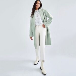 This is a menswear-inspired single-breasted jacket with a notched collar, inseam pockets and dropped shoulders. It’s made from boiled merino wool that’s plush, dense and textural.