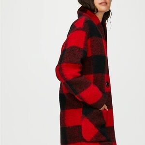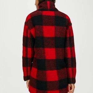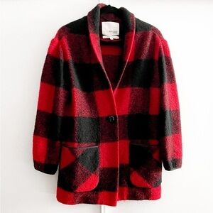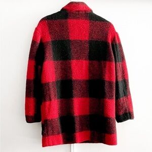 Mmmm, cozy. This is a lightweight, cocoon jacket with a shawl collar and a slight drop shoulder. It's made with a textured, wool blend from Italy. Classic buffalo-check plaid is yarn dyed which means the pattern is woven right in. Neat.