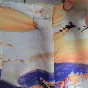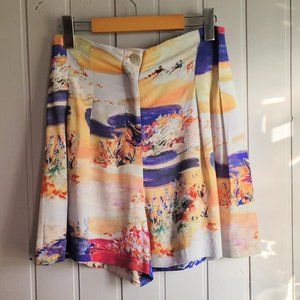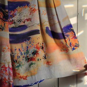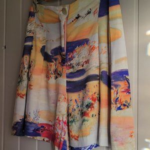 These are high-waisted, wide-leg short with inseam pockets and an elastic waistband. They’re cut from ReCrepe, lightweight, drapey crepe fabric made with LENZING™ ECOVERO™ Viscose — wood-based fibres sourced from responsibly managed forests and produced through an environmentally low-impact process. These ones come in a hand-painted Watercolour print that’s exclusive to the brand.