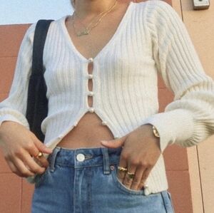 We're just living in it. This is a long-sleeve cardigan with a plunging V-neck, a bell sleeve and decorative pearl buttons. It's knit with a soft, lightweight wool blend.