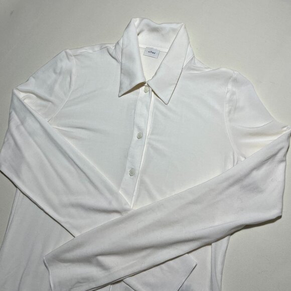 Collared button-up longsleeve with a rounded hem. It's made from stretchy, slightly sheer fabric. The colour is light birch//cream with yellow undertones.