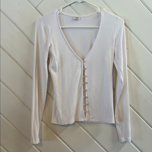Chic button-down with a deep V-neck. Long sleeves and elegant design. Ideal for versatile styling.