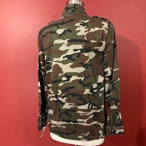 WILLOW & CLAY Women's Army Green Camo Jacket - Size Small - NWT. Customize a look with a bold statement! This on-trend camo jacket is all about signature style thanks to its iconic GI-Joe print and boxy fit. Multiple utility pockets and side zippers offer great compartments for fashionable gear. 100% cotton, made in China. Two chest zippered pockets. Two front pockets. Partial elastic in bottom hem. Button front.