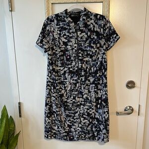 This stylish short sleeve dress features a unique pattern in black, white, and gray tones. Perfect for any occasion, it offers a modern and chic look.